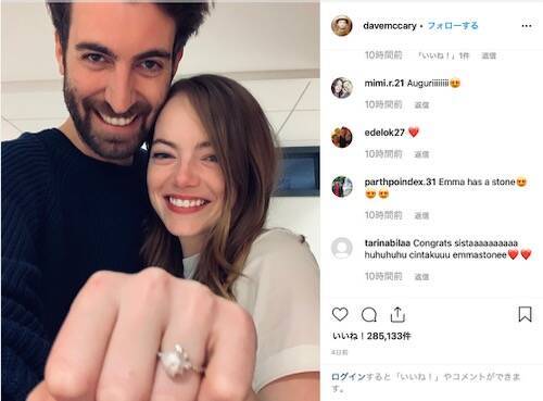 昨年末に婚約した時の、エマ・ストーンと婚約者デイヴ・マッカリーとのツーショット/デイヴ・マッカリーのInstagramより
