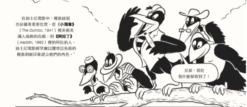 在迪士尼電影中,種族歧視也佔據著重要位置。從《小飛象》(The Dumbo, 1941)裡非裔美國人風格的烏鴉,到《阿拉丁》(Aladdin, 1992)裡的阿拉伯人,迪士尼電影經常繪以露骨且負面的種族刻板印象建立他們的角色。