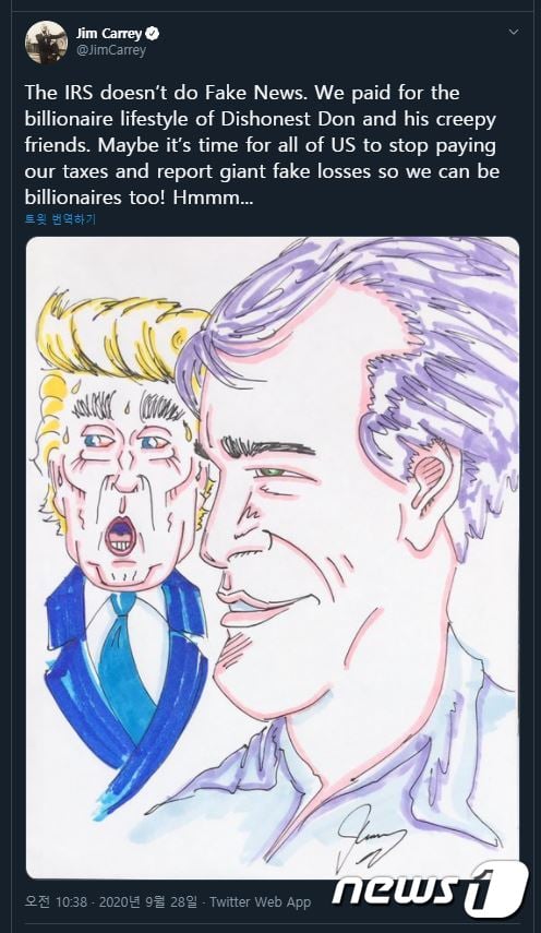 | 미국 할리우드 배우 짐 캐리가 27일(현지시간) 트위터에 도널드 트럼프 대통령의 탈세 의혹을 비판하는 내용의 글과 그림을 올렸다. (짐 캐리 트위터 캡처) © 뉴스1 |